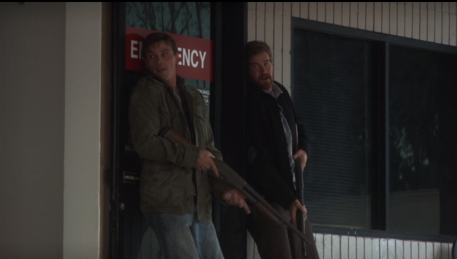 As Jake and Eric exit their vehicle. Eric stoops to pickup a leaflet about water contamination. Eric demonstrates pretty poor gun handling and clearly would have covered Jake with the muzzle of his shotgun during this action. The pair is fired upon while Eric lackadaisically carries the shotgun without a firing grip.